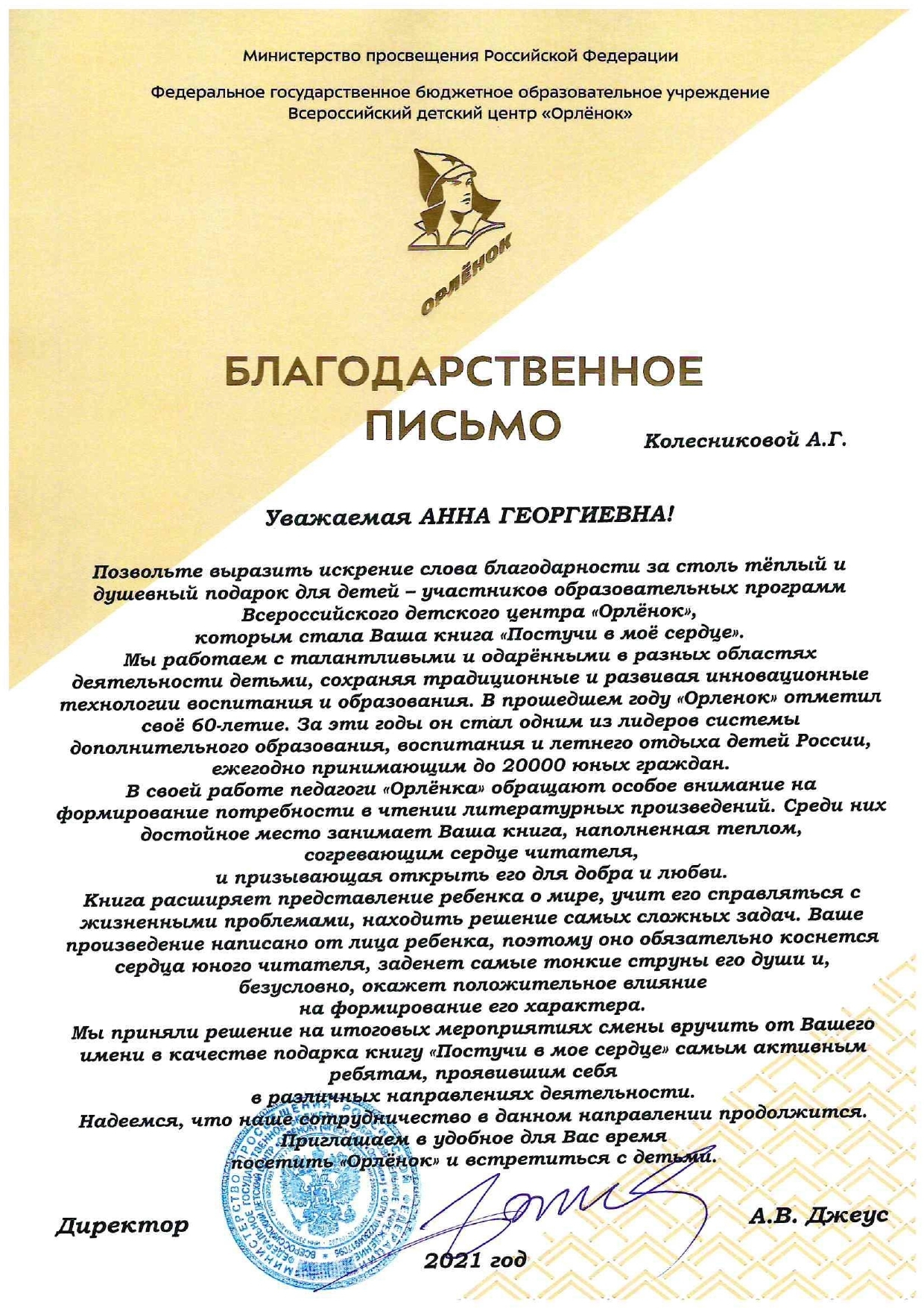 Руководство ВДЦ «Орлёнок» в лице директора А.В. Джеуса выразил благодарность автору книги «Постучи в моё сердце» за душевный подарок для детей-участников образовательных программ.